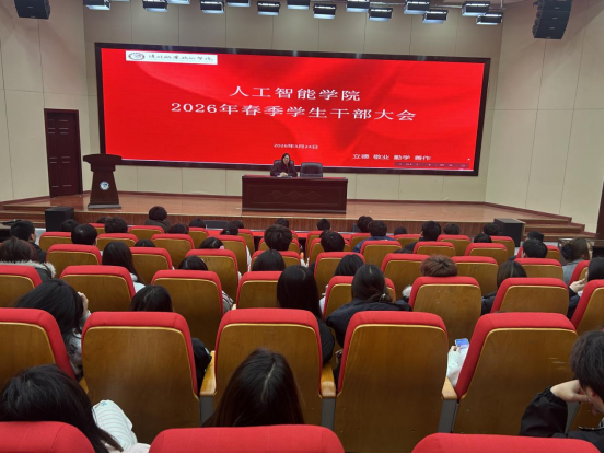 为夯实学生干部队伍建设,明确春季学期工作方向,凝聚青年骨干奋进力量,3月24日,我院在学术报告厅一楼召开2026年春季学生干部大会,学院党总支书记任从蓉、副书记张婷、团总支书记胡佼佼及全体学生干部参会。